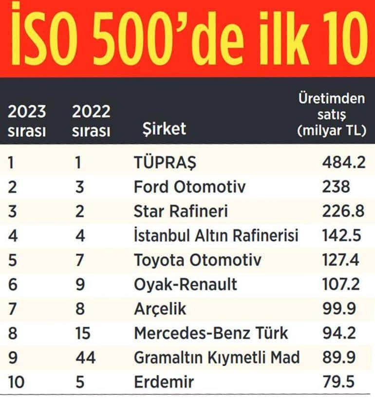 Ebru Sungur – İstanbul Sanayi Odası (İSO) ‘Türkiye’nin 500 Büyük Sanayi Kuruluşu Araştırması’nın 2023 yılı sonuçlarını açıkladı. Üretimden satışlara göre yapılan sıralamada Tüpraş, Ford Otomotiv ve Star Rafineri ilk üçte yer aldı. En büyük 500 sanayi şirketinin toplam üretimden satışları 2022’de yüzde 119 artarken 2023’te bu oran yüzde 42.1 oldu. İSO Başkanı Erdal Bahçıvan, bu gerilemenin nedenini, “Yavaşlayan küresel talep, 6 Şubat’ta ardı ardına yaşadığımız deprem felaketleri ve seçimler sonrasında ekonomi politikalarında yaşanan değişim belirleyici rol oynadı” sözleriyle açıkladı. İSO 500 şirketlerinin üretimden satış toplamı 2023’te 6 trilyon 375 milyar lira oldu. Bahçıvan, enflasyondan arındırıldığında üretimden satışların yüzde 13.2 azaldığını vurguladı.