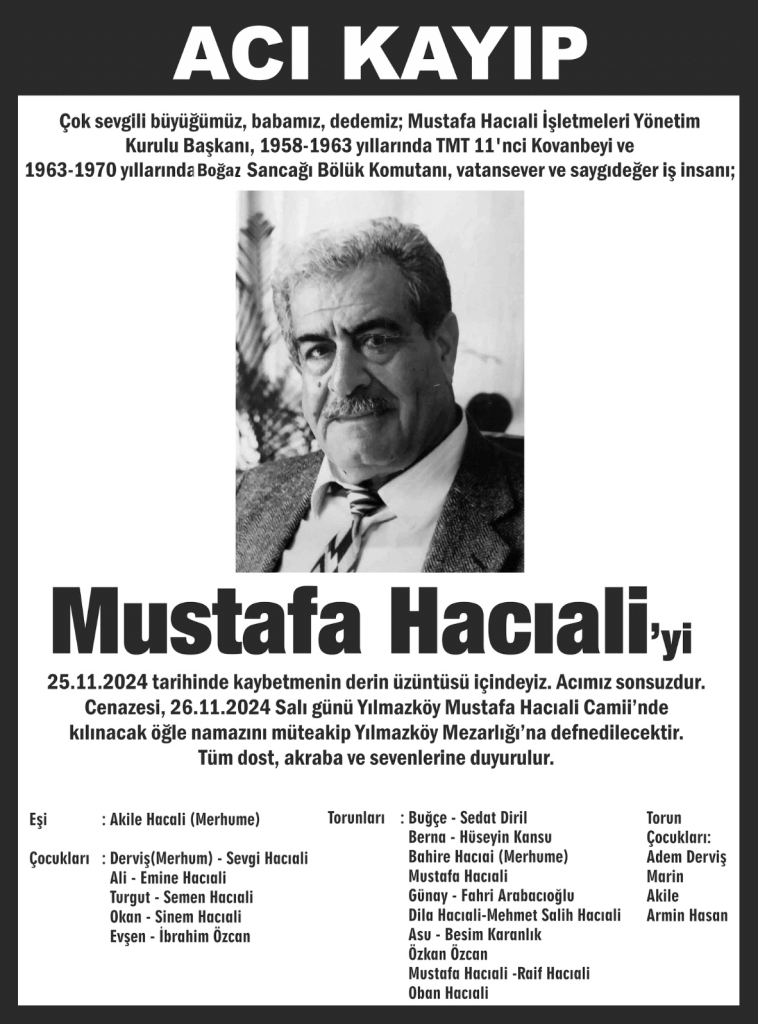 Ülkemizde yıllardır gıda ve inşaat sektörü olmak üzere çeşitli sektörlerde hizmet veren iş insanlarından Mustafa Hacıali vefat etti.Mustafa Hacıali’nin yarın Yılmazköy’deki aile kabristanlığına defnedileceği öğrenildi.Yılmazköy Spor Kulübü’nün ana sponsorluğunu üstlenen Mustafa Hacıali için kulüp binasında da tören yapılacak. Mustafa Hacıali Yılmazköy Spor Kulübü konuyla ilgili açıklamasında “Kulübümüzün Ana sponsoru olan Hacıali LTD direktörü Sn. Mustafa Hacıalinin vefatını derin bir üzüntü ile öğrenmiş bulunmaktayız. Hacıali ailesine ve tüm camiamıza başsağlıgı diler,Mustafa Hacıali amcamıza Allah’dan rahmet dileriz. İlk cenaze töreni yarın saat 11:00 de kulüp lokalinde olacakdır. Daha sonra Yılmazköy camisinde kılınacak cenaze namazının ardından Yılmazköy’deki aile kabristanlığına defnedilecektir.Hepimizin başı sağolsun” ifadeleri kullanıldı. Kaynak: Mustafa Hacıali hayatını kaybetti