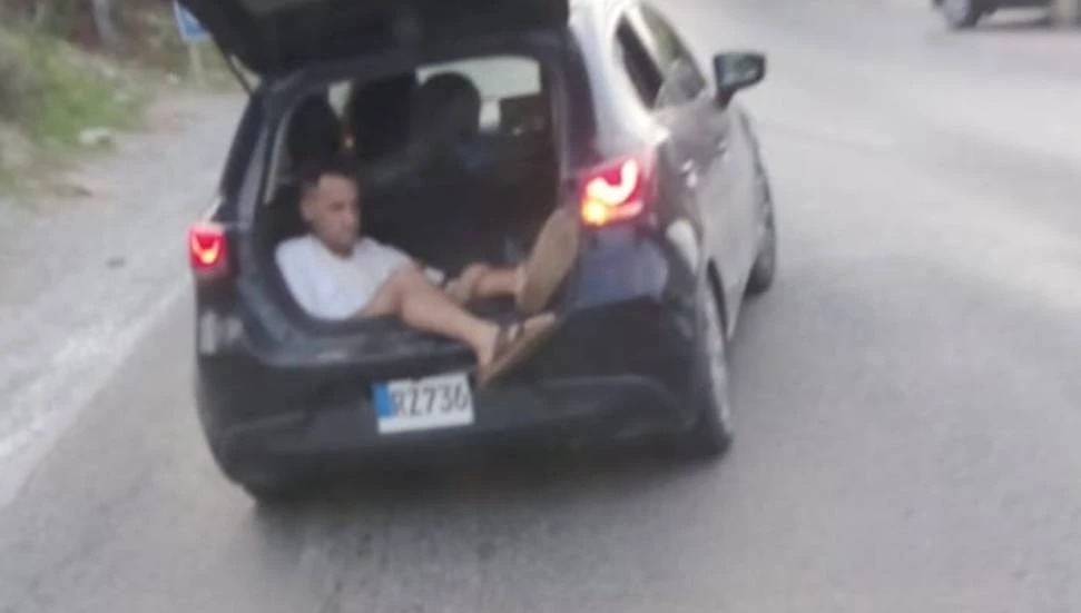 Bir sürücünün otomobilinin bagajında seyahat eden bir kişi, diğer araç sahiplerinin dikkatini çekti.