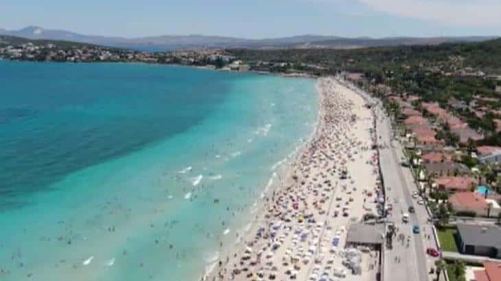 Öte yandan dünyaca ünlü Ilıca Plajı, tatilcilerin akınına uğradı. Plajda, iğne atılsa yere düşmeyecek bir kalabalık oluşurken, vatandaşlar bunaltıcı sıcakta kendini serin sulara bırakarak denizin ve tatilin keyfini çıkardı. Dolup taşan plajdaki yoğunluk ise havadan görüntülendi.