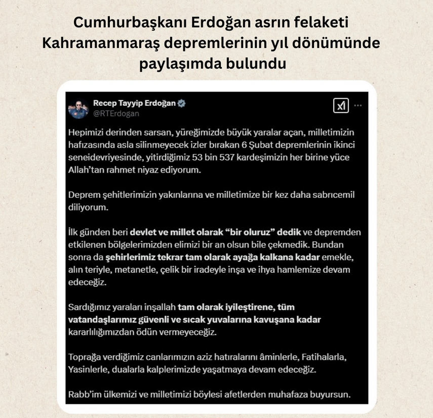 Cumhurbaşkanı Recep Tayyip Erdoğan, “Deprem şehitlerimizin yakınlarına ve milletimize bir kez daha sabrıcemil diliyorum. İlk günden beri devlet ve millet olarak ‘Bir oluruz’ dedik ve depremden etkilenen bölgelerimizden elimizi bir an olsun bile çekmedik.” ifadesini kullandı.