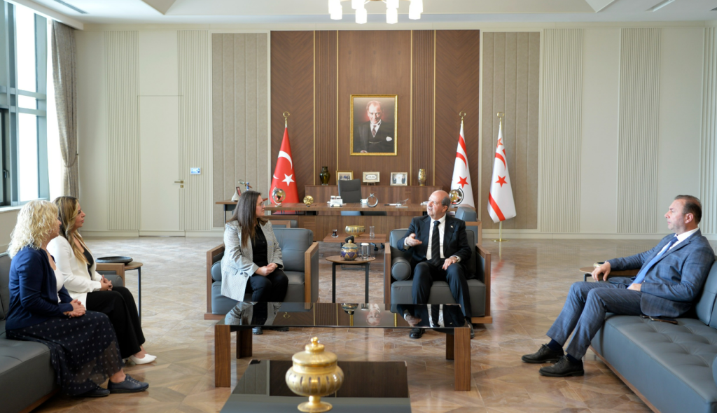 Cumhurbaşkanı Ersin Tatar, Atatürk Meslek Lisesi Müdürü Fatoş Tuncay ve beraberindeki heyeti kabul etti.