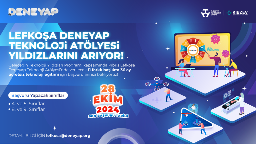 Deneyap Teknoloji Atölyeleri için son başvuru tarihi 28 Ekim olarak açıklandı. Açıklamaya göre başvuru 4. sınıf, 5. sınıf, 8. sınıf ve 9. sınıfta okuyan öğrencilere açık. Başvuran adaylar 2-3 Kasım tarihlerinde Lefkoşa Türk Lisesi’nde yapılacak sınava katılacak. Sınav, matematik, fen, algoritma ve genel kültür konularından toplam 40 sorudan oluşacak.