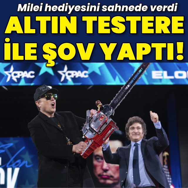Konferansa katılan Arjantin Devlet Başkanı Milei tarafından kendisine hediye edilen altından yapılmış büyük bir elektrikli testere ile sahnede poz veren Musk, “Bu testere bürokrasi için” diye bağırdı.