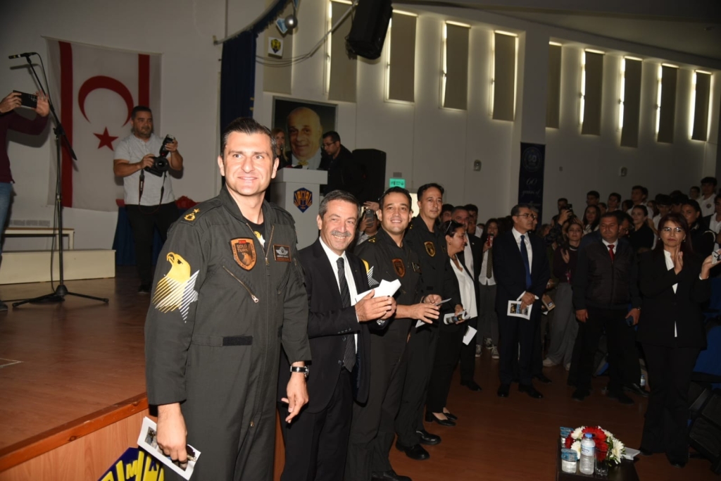 Kabulün ardından Ertuğruloğlu, pilotlarla birlikte Lefkoşa Türk Maarif Koleji’ni (TMK) ziyaret edip, öğrencilerle bir araya geldi.