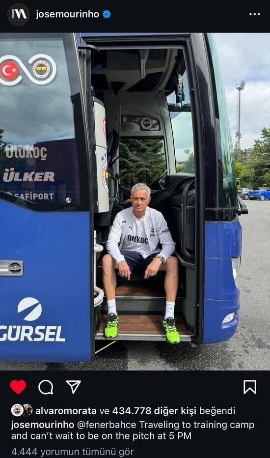 Portekizli teknik adam Jose Mourinho, Fenerbahçe’deki birinci antrenman günü öncesi kadro otobüsünden ‘Sahada olmak için sabırsızlanıyorum’ bildirili bir paylaşım yaptı.