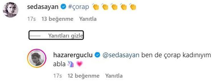 Katıldığı törende ‘Yılın En Stil Sahibi Kadın Oyuncusu’ seçilen Hazar Ergüçlü’nün sosyal medya paylaşımlarına Seda Sayan’dan yorum geldi. “Ben çorap kadınıyım” sözleriyle hafızalara kazınan Seda Sayan oyuncunun paylaşımına “çorap” yazıp alkış emojisi koydu.