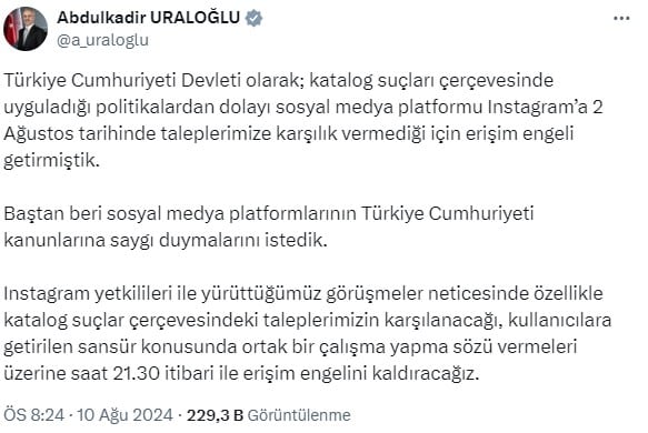 Bakan Uraloğlu, sosyal medya hesabından yaptığı açıklamada şunları söyledi: “Türkiye Cumhuriyeti Devleti olarak; katalog suçları çerçevesinde uyguladığı politikalardan dolayı sosyal medya platformu Instagram‘a 2 Ağustos tarihinde taleplerimize karşılık vermediği için erişim engeli getirmiştik.