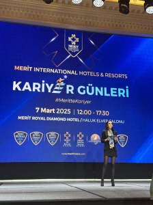 Merit International Otelleri 4. Kariyer Günleri’nde, öğrencileri ağırlamaktan duyduğu heyecanı ve mutluluğu dile getiren Merit Otelleri İnsan Kaynakları Koordinatörü Ayperi Beyazıt, “Kuzey Kıbrıs’ta toplam sekiz otelimiz ile adanın en büyük turizm yatırımcısı ve sektörün en büyük istihdam sağlayan işletmesiyiz. Bu başarının sürdürülebilir ve geliştirilebilir olabilmesi için en büyük etkenlerden birinin de insan gücü olduğunun bilincindeyiz. Merit Otelleri İnsan Kaynakları Koordinatörlüğü olarak, insan kaynakları yönetiminin öneminin farkındalığı ile faaliyetlerimizi yürütmekteyiz” dedi. Çalışanlarının kariyer hedeflerine ulaşabilmesi için her türlü imkânı sağlamaya gayret ettiklerini ifade eden Beyazıt, “Eğitim programlarından, kariyer geliştirme olanaklarına, iş güvenliğinden barınma, ulaşım, yeme-içme gibi temel ihtiyaçların sağlanmasına, psikolojik danışmanlık hizmetinden, Merit Personelleri Yardımlaşma ve Dayanışma Derneği (MEP-DER) çatısı altındaki desteklerimize kadar birçok alanda çalışanlarımızın yanında olarak hep beraber gelişiyor ve büyüyoruz” dedi.