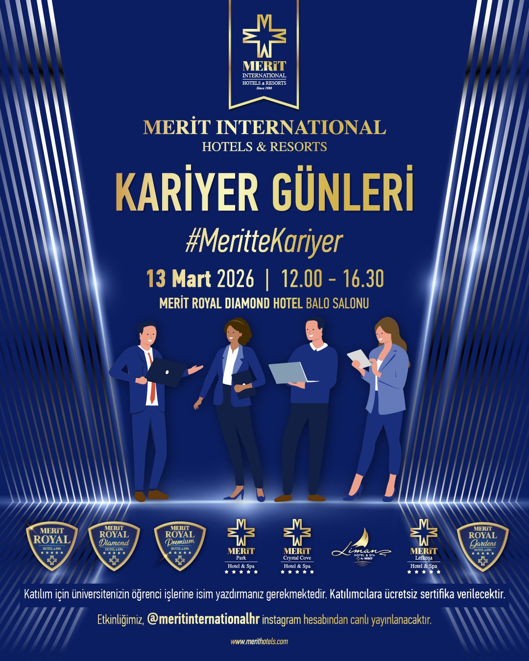 Merit Oteller Grubu tarafından her yıl geleneksel olarak düzenlenen ve üniversite öğrencileri ile sektör profesyonellerini buluşturan Merit Kariyer Günleri etkinliğinin beşincisi, 13 Mart Cuma günü Merit Royal Diamond Otel’de gerçekleştirilecek.
