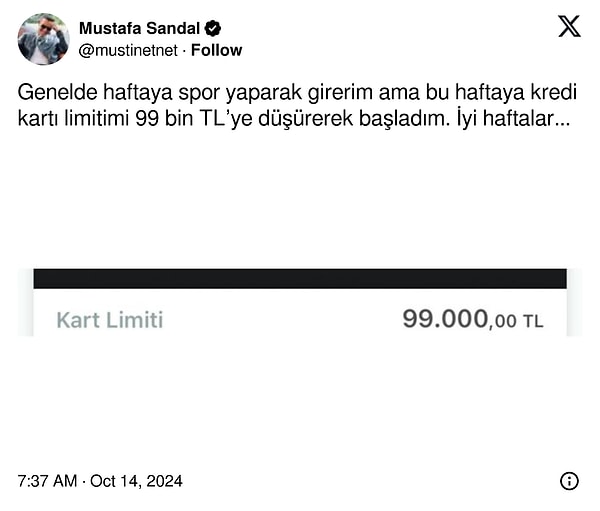 ‘Genelde haftaya spor yaparak girerim ama bu haftaya kredi kartı limitimi 99 bin TL’ye düşürerek başladım. İyi haftalar…’